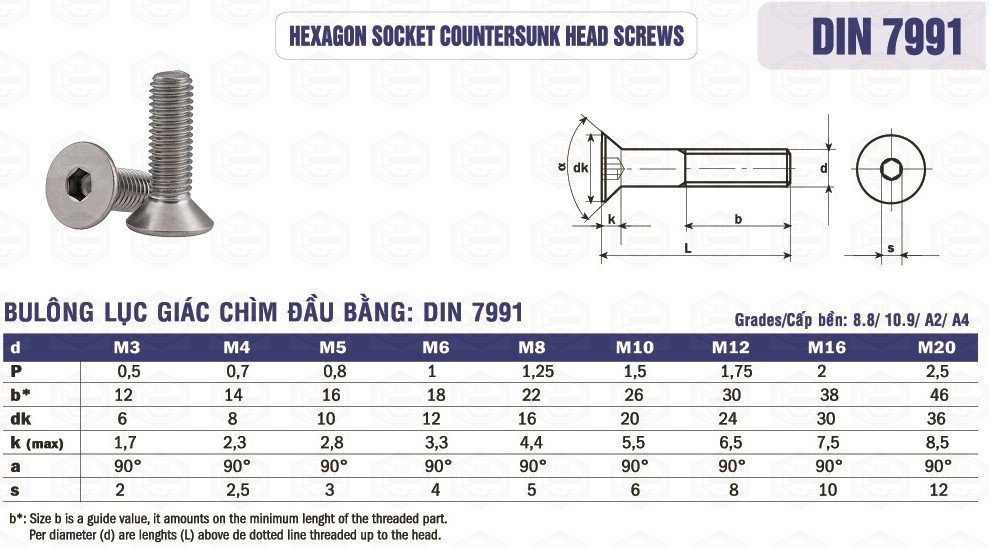 Bulông inox lục giác chìm đầu bằng Din 7991 được sản xuất từ bốn loại mác thép inox sau: