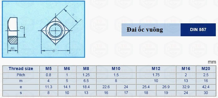 Sản phẩm đai ốc vuông inox (êcu vuông inox ) được thiết kế và sản xuất theo tiêu chuẩn Din 557. Tiêu chuẩn Din 557 là một tiêu chuẩn của Đức, chuyên được áp dụng để sản xuất đai ốc vuông inox (êcu vuông inox). Dưới đây là bảng thông số kỹ thuật của sản phẩm đai ốc vuông inox (êcu vuông inox).