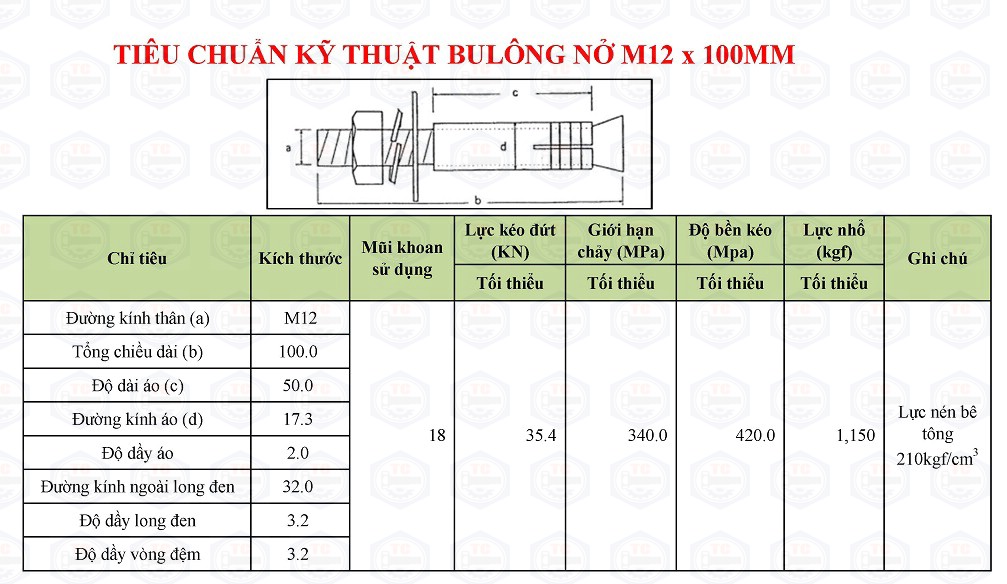 Tiêu chuẩn kỹ thuật bulông nở M12 x 100: