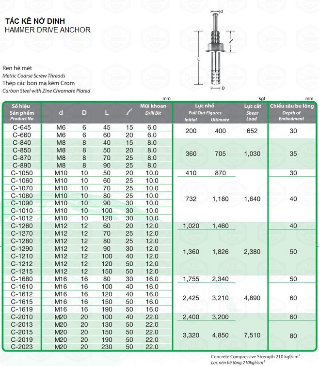 Trong bảng thông số kỹ thuật của tắc kê nở đinh dưới đây, chúng tôi có liệt kê bảng quy cách của tắc kê nở đinh, kích thước mũi khoan phù hợp với từng loại, khả năng chịu lực nhổ, khả năng chịu lực cắt và chiều sâu của tắc kê nở.