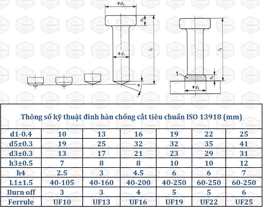 Đinh hàn chống cắt được sản xuất theo tiêu chuẩn ISO 13918, đây là tiêu chuẩn sản xuất và chế tạo đinh hàn chống cắt sử dụng rộng rãi nhất trên thế giới hiện nay. Dưới đây là bảng thông số kỹ thuật của sản phẩm đinh hàn chống cắt theo tiêu chuẩn ISO 13918:
