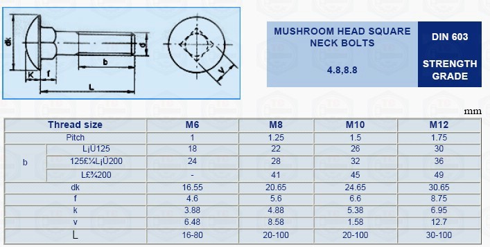 Nếu theo thiết kế mà phải sử dụng loại bu lông đầu tròn cổ vuông không nằm trong bảng thông số tiêu chuẩn Din 603 thì loại bu lông đó phải gia công theo bản vẽ, khi đó giá thành sẽ cao hơn giá của bu lông theo tiêu chuẩn.