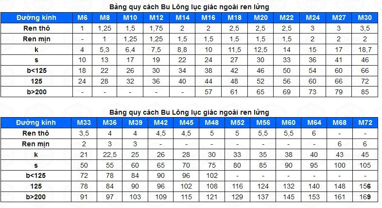 Hiện nay thì sản phẩm bu lông inox ren lửng din 931 được tiêu chuẩn hóa quốc tế theo tiêu chuẩn Din 931 của Đức, tiện ren hệ mét, đây là loại sử dụng phổ biến nhất trên thị trường Việt Nam hiện nay. Dưới đây là bảng tiêu chuẩn kỹ thuật của sản phẩm bu lông inox ren lửng, theo tiêu chuẩn Din 931: