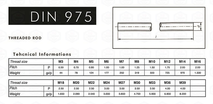 Bảng thông số kỹ thuật của thanh ren inox 201, 304, 316 theo tiêu chuẩn din 975:
